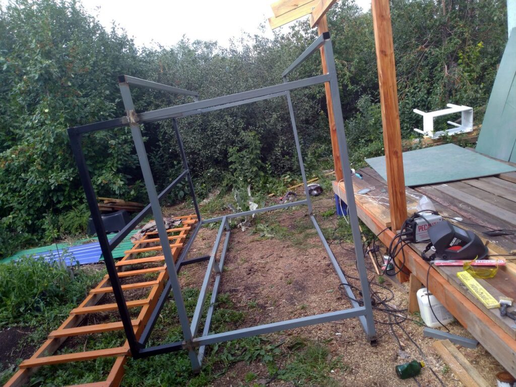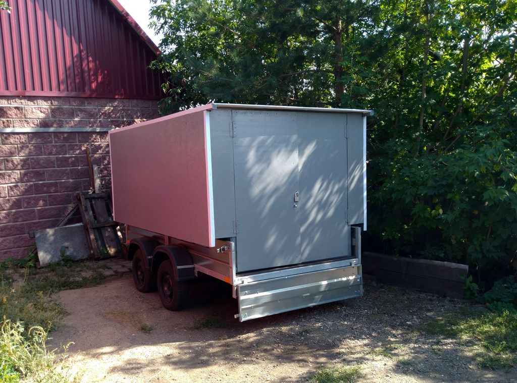 Построил себе домик на прицеп, для путешествий. Каркас металопрофиль кквадрат 40х40х2 мм, обшит ОСБ плита 9 мм, в перспективе буду менять, задние двери фанера 8 мм, не утеплён, для теплого времени. Был использован пару раз до минус 10, с газовым инфракрасным обогревателем, не замёрз), для этого всё таки надо утеплять)) Дом съёмный, закреплён на 4 болтах, можно использовать стационарно, без прицепа.